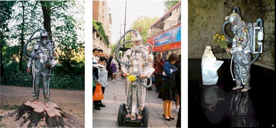 EarthMan has performed in Houston ( Divers Works, Art Car Museum, Foto Fest, Art Car Parade), Austin (Texas State Capital, Austin Museum of Art, Art Car Parade, Texas Biennial 2011), Jeddo, San Antonio(Texas Biennial 2013),Marfa, Texas, San Francisco, Oakland, New Mexico, Arizona, Sonoma County, Charlotte, Monaco, Callas (France), London ( Tate Modern, National Portrait Gallery, Serpentine Gallery, Trafalgar Square, Hyde Park, 7 miles of the London Marathon, Speakers Corner, Covent Garden Piazza), Lincoln (Lincoln Catherdral and Steep Hill), Arlesey, Cambridge and Cambridge University (England), Paris ( Palais de Tokyo, Musee de l'Art Moderne, Centre Georges Pompidou, Louvre, Espace des Blancs Monteaux), Normandy American Cemetery, Geneva ( MAMCO, Centre d'art Comtemporain Genéve, Mont Blanc Bridge, UN Office at Geneva), Fort l'écluse, Léaz, Ain, France, Montreux, Art Forum Montreux, Basel, Art Basel Vernissage, Seattle ( City and Seattle Art Museum, Bob's Salsa party), Herbert Bayer's Mill Creek Canyon Earthworks ( Kent,WA), Vancouver, BC, Chicago ( Museum of Contemporary Art Chicago, Select Media Festival, Magnificent Mile, Art Chicago, NEXT, Version Fest ), Miami (Miami Beach, Art Basel Miami Beach, Pulse Miami, Scope Miami, Rubell Family Collection, Bridge Miami, Fountain Miami), Brighton,England, Tunbridge Wells, Clapham Common, and around and around. . .